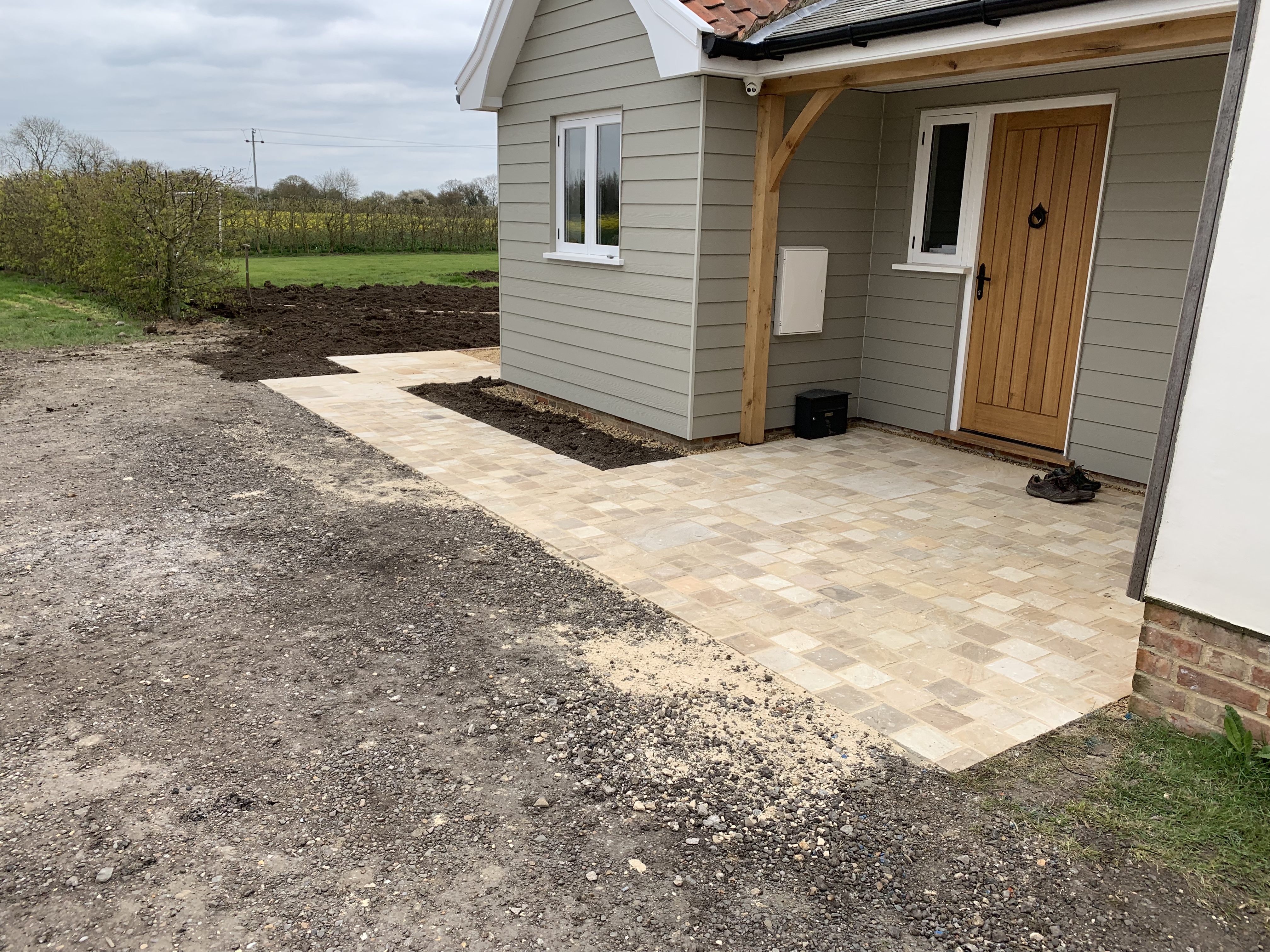 Working with a Garden designer on this landscaping project we supplied Plant Hire, Materials and Labor to scrape and clear existing turf and soil and completely transformed the garden with Curved brick edgings, Sandstone patio area, Shingle paths, Oak Sleeper retainers and raised beds and Sandstone setts at the front entrance.